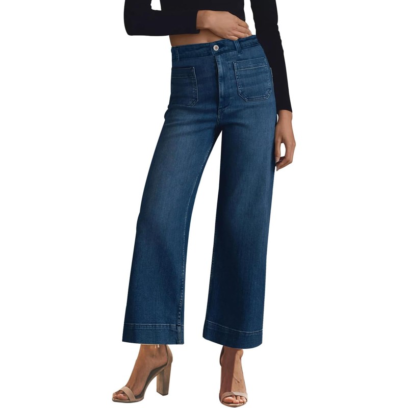 - High waisted wide leg jeans for women. zipper and button closure, front patch pockets.